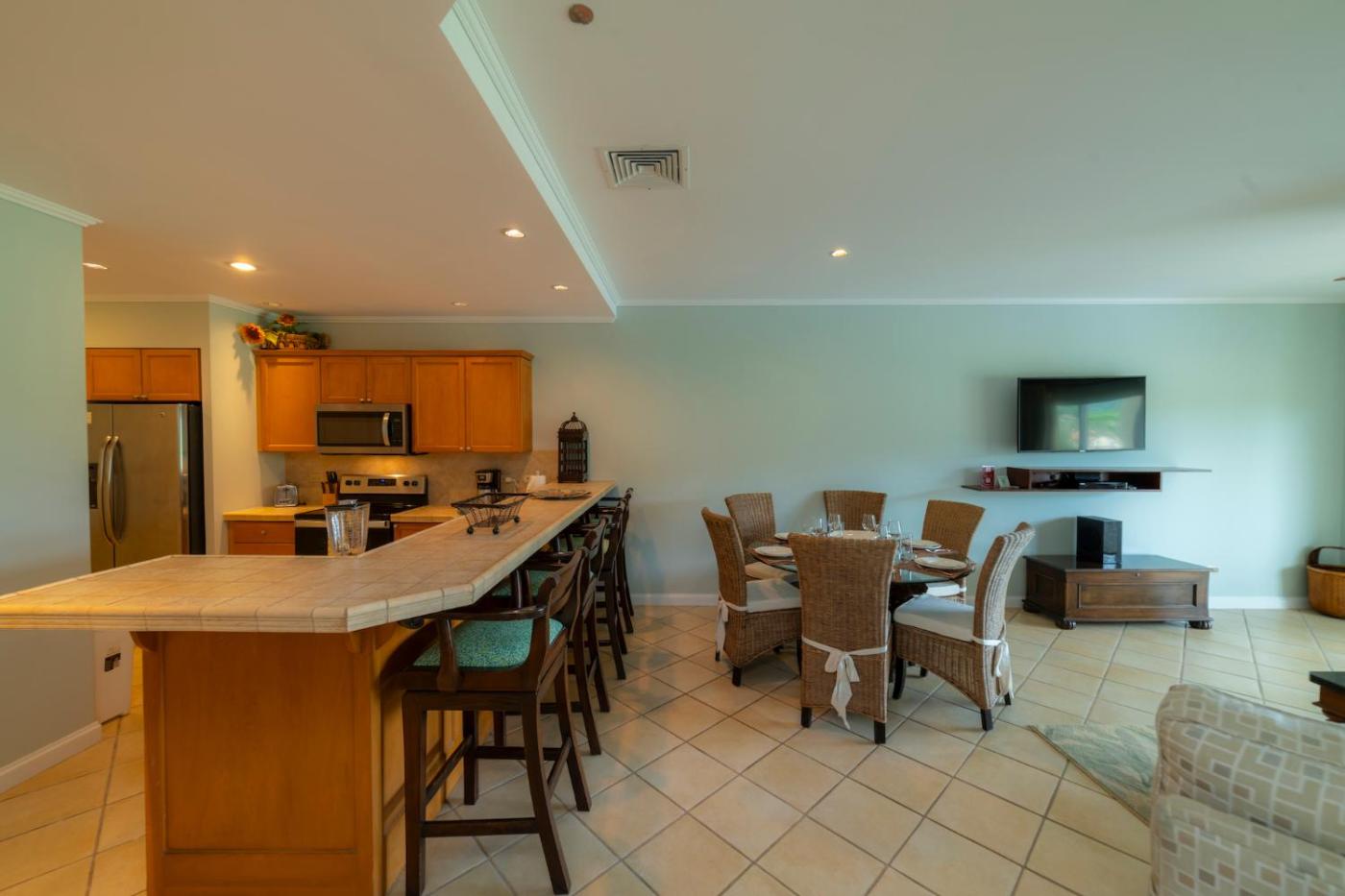 Three-Bedroom Apartment. This spacious apartment comprises 3 bedrooms, a kitchen and 2 bathrooms with a bath and a shower. Guests will find a stovetop, a refrigerator, a dishwasher and kitchenware in the kitchen. The apartment also provides guests with a barbecue. The air-conditioned apartment provides a TV with cable channels, a washing machine, a tea and coffee maker, tumble dryer as well as sea views. The unit offers 4 beds.